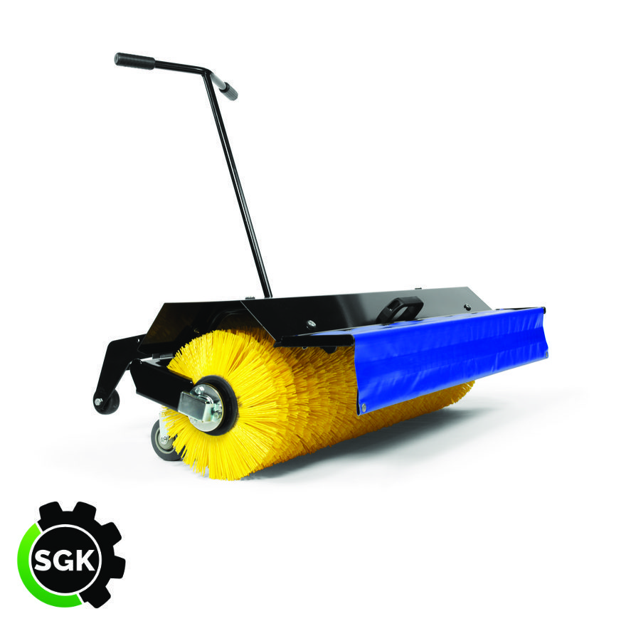 Rotating broom for sweeping up leaves, snow, etc. Can be angled to either side. The broom has an included Spray guard.